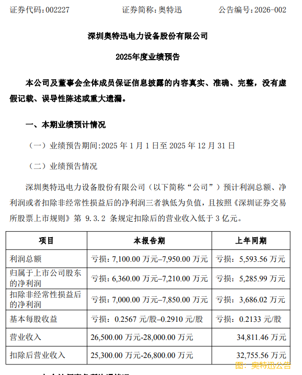 【财华社讯】1月29日,奥特迅(002227.SZ)公告,经公司财务部门初步测算,预计公司2025年度经审计的利润总额、净利润、扣除非经常性损益后的净利润三者孰低为负值,且扣除后的营业收入低于3亿元,根据相关规定,在公司2025年年度报告披露后,公司股票交易可能被深圳证券交易所实施退市风险警示(股票简称前冠以“*ST”字样)。