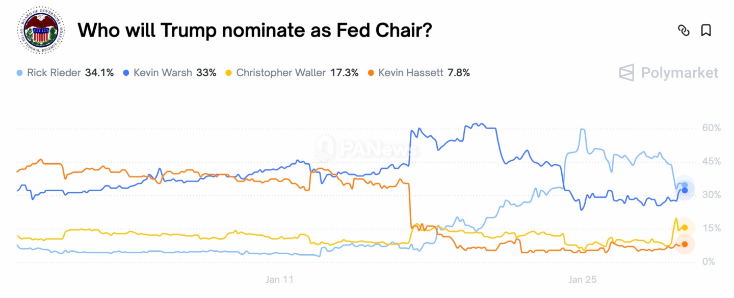 他当天在Polymarket等预测市场上胜选的概率从3%翻倍至6%;而在达沃斯论坛上特朗普对其大加赞赏之后,Rieder的胜率更是一度飙升至60%。截至1月29日,Rieder与前美联储理事凯文·沃什并驾齐驱,概率均在33%左右: