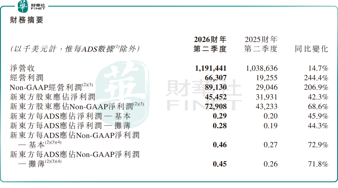 财报显示,2026财年二季度,新东方净营收约11.91亿美元,同比增长14.7%;经营利润6630.7万美元,同比暴增244.4%;归母净利润为4545.2万美元,同比增长42.3%。