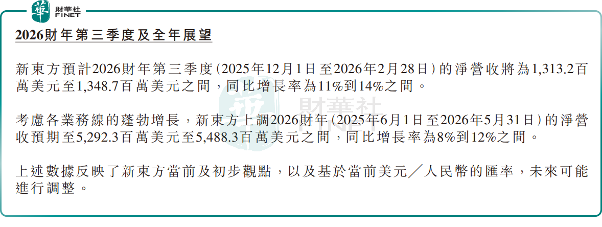 同时,考虑到各业务线的蓬勃增长,新东方还上调2026财年(2025年6月1日至2026年5月31日)的净营收预期至52.92亿美元至54.88亿美元,同比增长率为8%到12%。