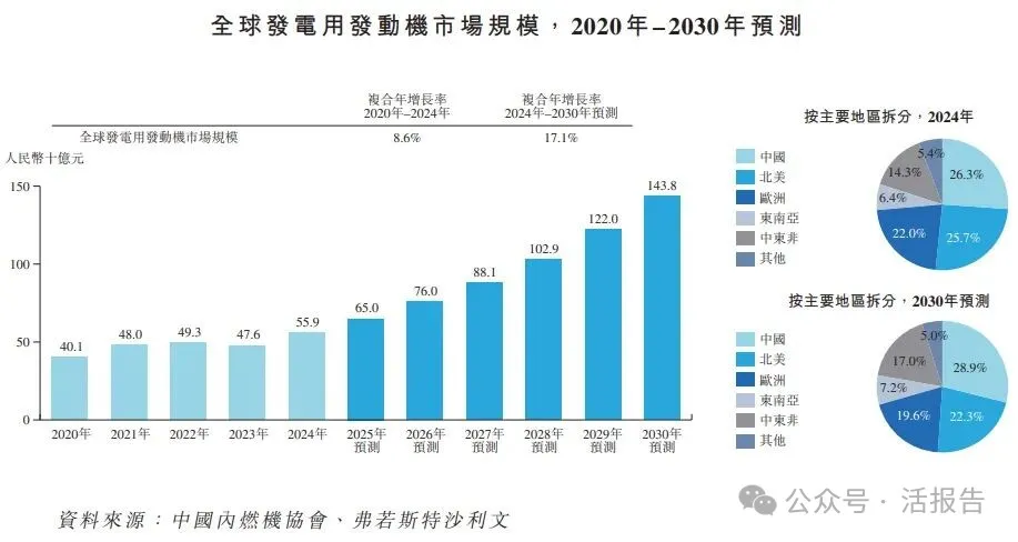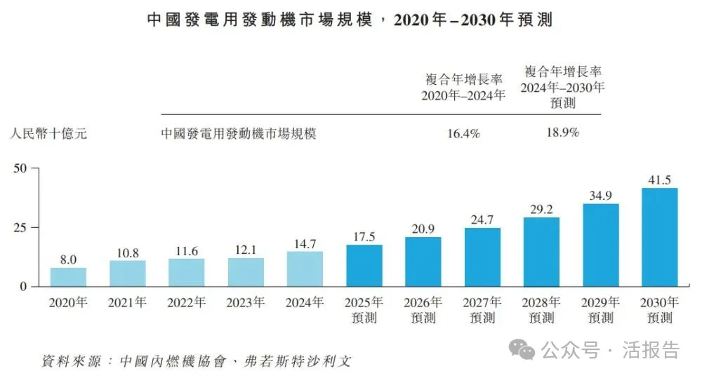 根据弗若斯特沙利文(Frost&Sullivan)的报告,就收入而言,全球发电用发动机市场由2020年的人民币401.0亿元增长至2024年的人民币559.0亿元,复合年增长率为8.6%。预期到2030年将达到人民币1,438.0亿元,2024年至2030年的复合年增长率为17.1%。