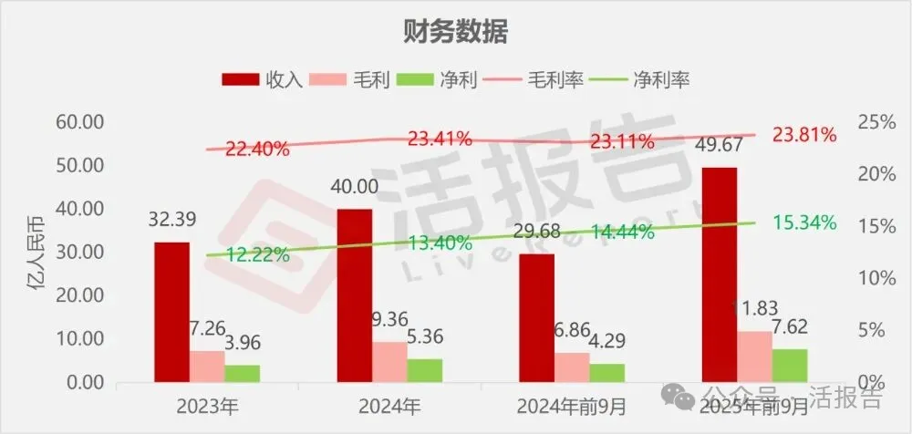 收入分别约为人民币32.39亿、40.00亿、29.68亿、49.67亿,2025年前9月同比+67.37%;