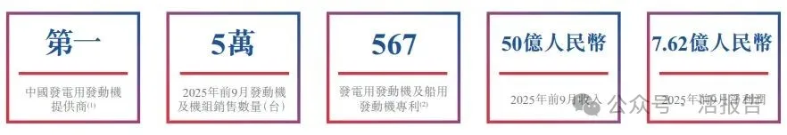公司是领先的发电动力解决方案供货商。根据弗若斯特沙利文的资料,按2024年中国发电用发动机的销售收入计,公司是中国最大的发电用发动机供货商,亦是中国领先的船用发动机供货商,按2024年中国中高速船用发动机销售收入计排名第二。