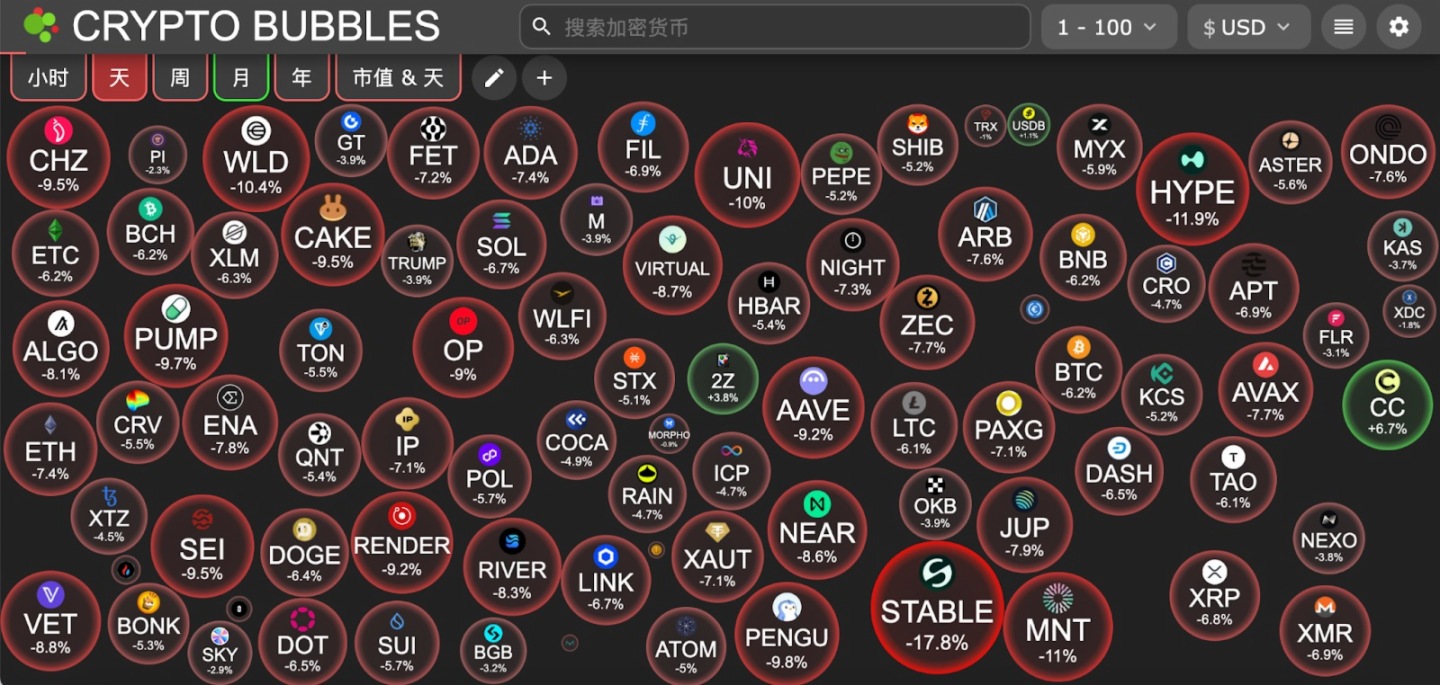 今日市值前100币种最大跌幅:Stable 跌 17.8%、Hyperliquid 跌 11.8%、Mantle 跌 11%、Worldcoin 跌 10.3%、Uniswap 跌 10%。
