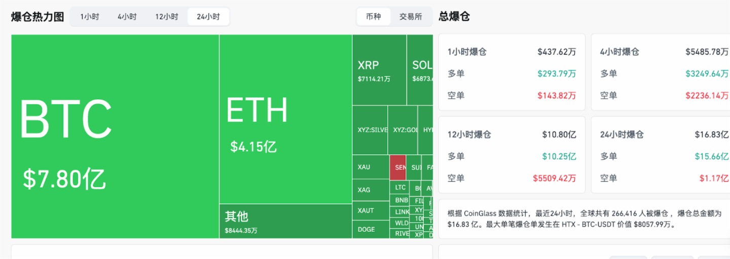 24小时爆仓数据:全球共266416人被爆仓 ,爆仓总金额为16.83亿美元,其BTC爆仓7.8亿美元、ETH爆仓4.15亿美元、XRP爆仓7114万美元