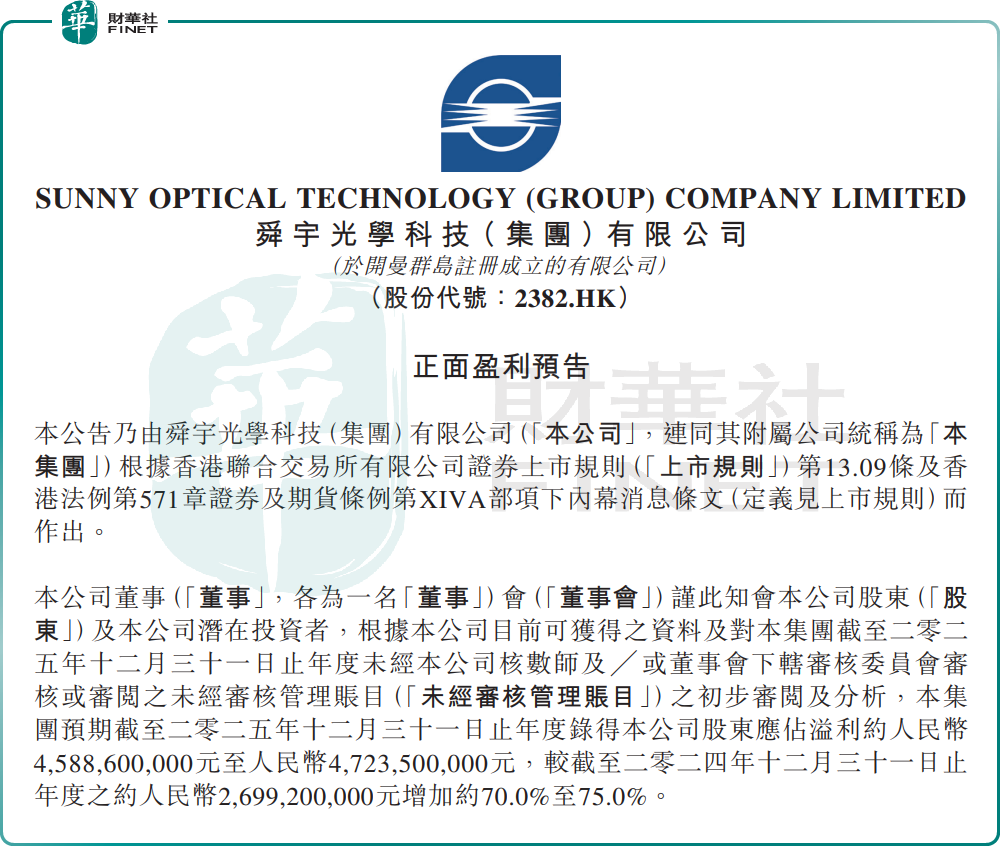 公告显示,舜宇光学科技预计,2025年公司归母净利润为45.89亿元至47.24亿元(单位人民币,下同),同比增加约70%至75%。