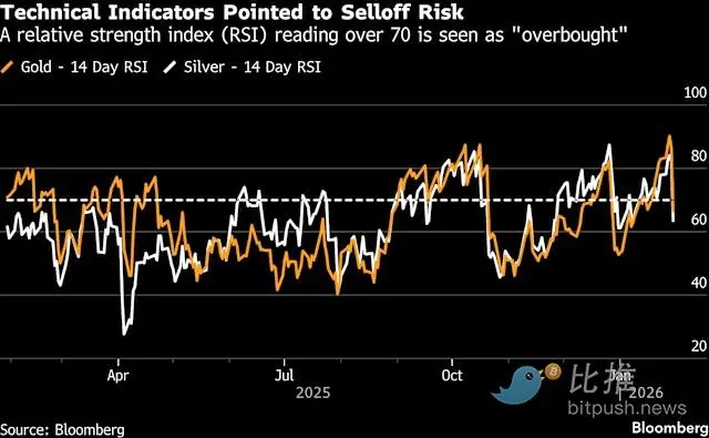 RSI指标见顶: 黄金的相对强弱指数(RSI)在暴跌前触及了40年来的峰值(RSI接近90),属于极端超买。