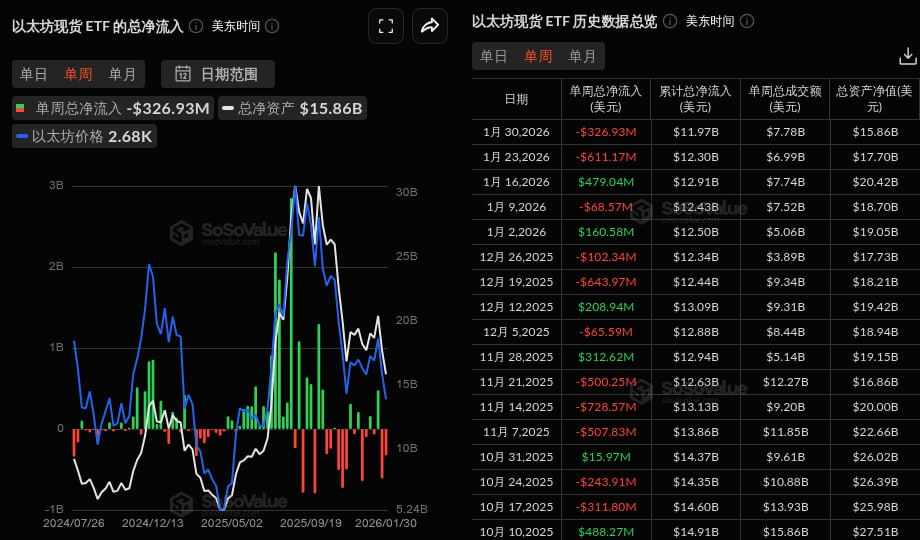 PANews 2月1日消息,根据 SoSoValue 数据,本周交易日(美东时间 1 月 26 日至 1 月 30 日)以太坊现货 ETF 净流出 3.27 亿美元。