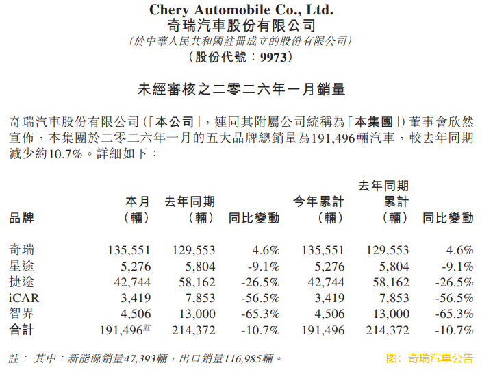 【财华社讯】奇瑞汽车(09973.HK)公布,于2026年1月的五大品牌总销量约为19.15万辆汽车,较去年同期减少约10.7%。