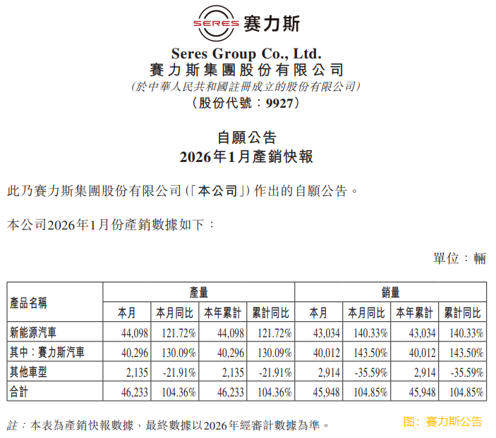 【财华社讯】赛力斯(09927.HK)公布,2026年1月份,汽车产量合计约4.62万辆,同比增加104.36%;汽车销量合计约4.59万辆,同比增加140.85%。其中,新能源汽车销量约4.3万辆,同比增加140.33%。