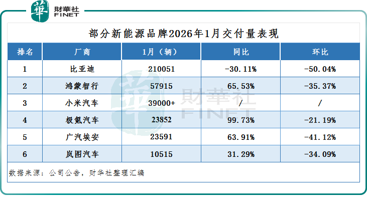 小米汽车方面,1月交付超3.9万辆,2025年12月为超5万辆,环比下降约22%。