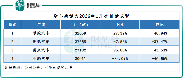 在新势力阵营中,零跑汽车依旧领先,1月交付新车32059辆,同比增长27.37%,环比下降46.94%。