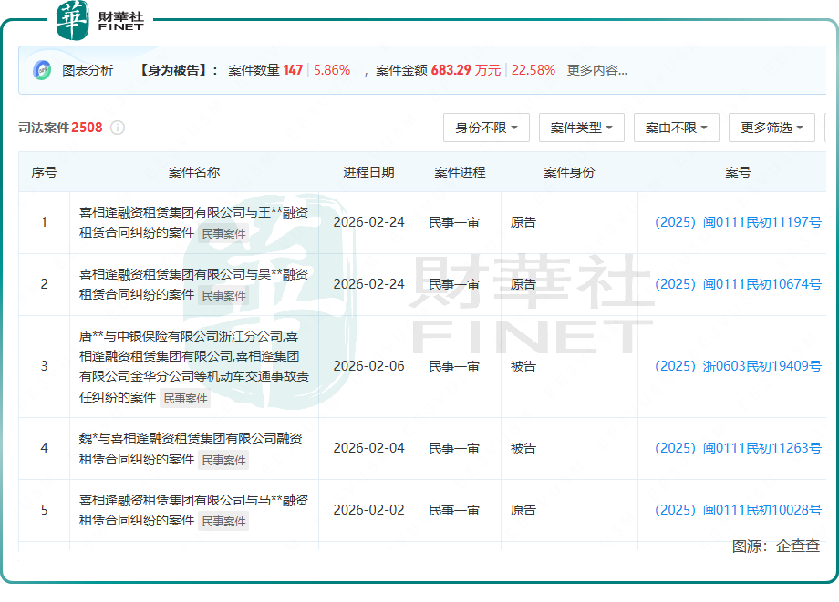 这家公司早已是法庭上的“常客”,合规与法律风险如影随形。企查查数据显示,截至目前,喜相逢及附属公司涉及的司法案件已高达2508件,其中147件为公司作为被告的案件,案件金额合计683.29万元。这些案件中,机动车交通事故责任纠纷、买卖合同纠纷占比较高,仅2026年以来,公司就新增6起被告案件。要知道,在汽车融资租赁模式下,租赁期内车辆所有权归公司所有,一旦承租方发生交通事故,公司极有可能被卷入诉讼,不仅要承担经济赔偿,还会损耗品牌信誉。