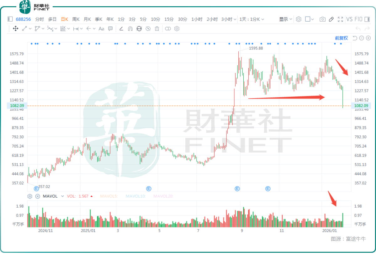 2月3日,近年来备受瞩目的AI算力概念股寒武纪(688256.SH)遭遇重挫。截至午间收盘,其股价放量下跌近13%,直接跌破前期高位盘整区间。