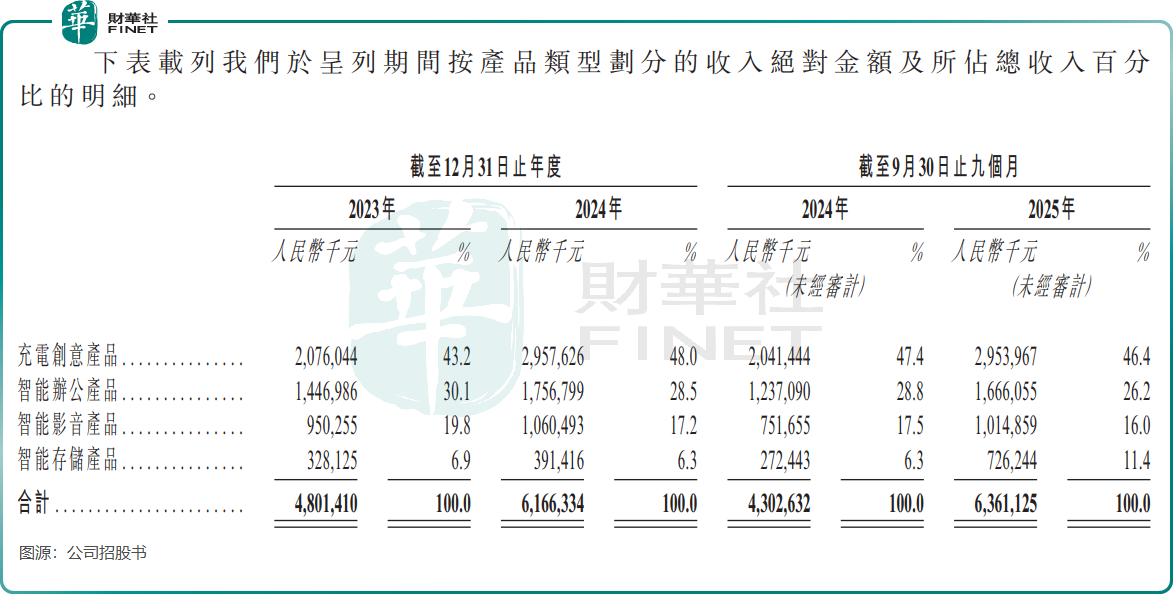 公司产品体系以充电创意产品、智能办公产品、智能影音产品和智能存储产品四大核心品类为支柱,覆盖家庭、出行、办公、娱乐等多元化的日常生活与应用场景。截至2025年9月30日,其产品已成功销往全球超过180个国家和地区,2025年前三季海外收入占比高达59.6%,海内外市场布局较为均衡。