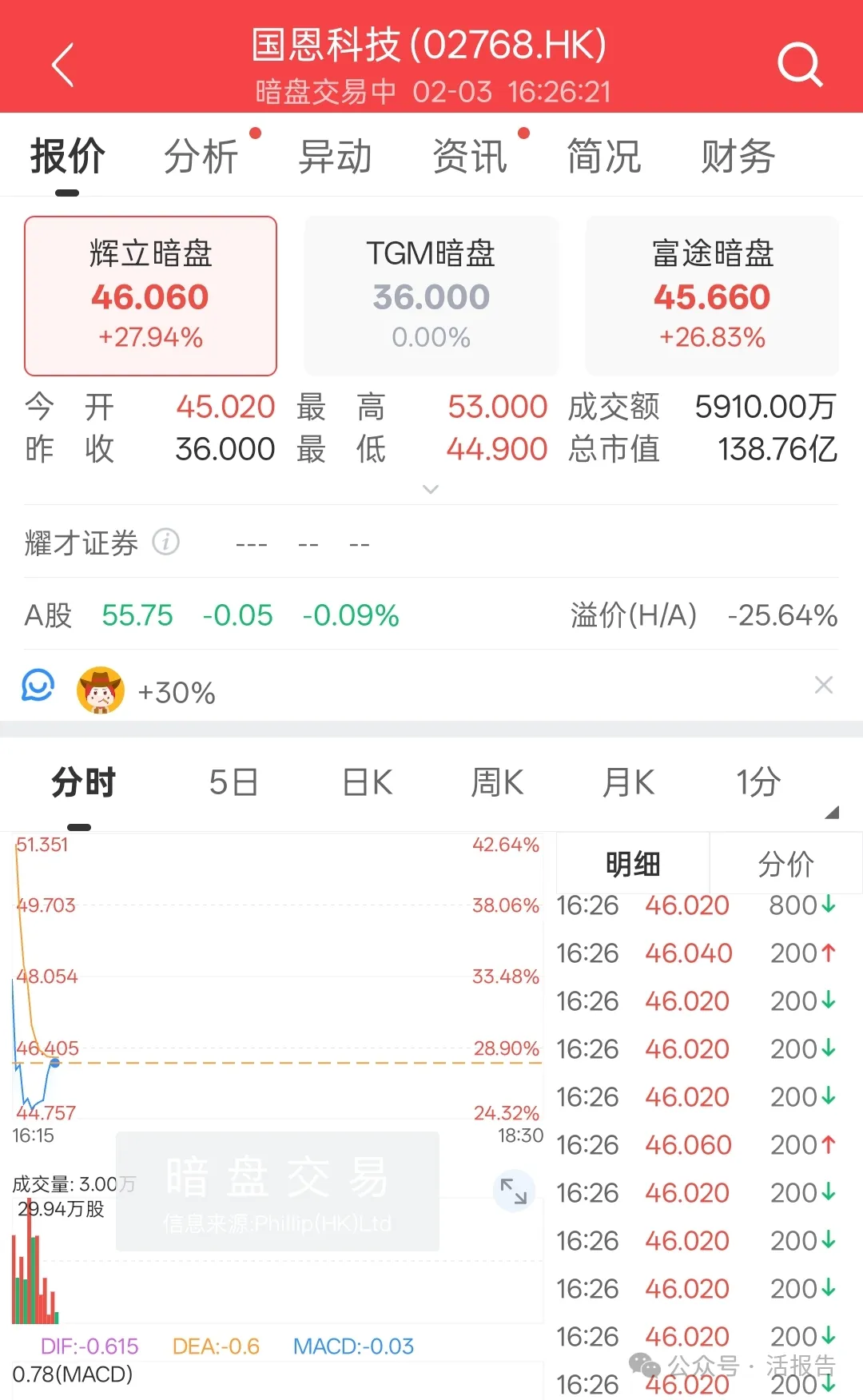 国恩科技暗盘以45.02港元高开25.06%,开盘后股价迅速上涨,一度涨至53.00港元,最高上涨47.22%;截至最新发稿,公司暗盘价报46.06港元,上涨27.94%。(盘面详情请看下图)