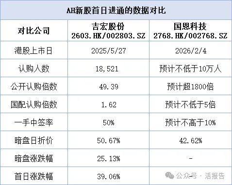 AH公司此次上市不设稳价期,并且首日即纳入港股通,这一情况并非首例。早在2025年5月27日,于港交所上市的吉宏股份(2603.HK)就已开创先河,成为首只通过IPO形式在上市首日便纳入港股通的股票。受入通利好影响,该公司股价于上市首日上涨39%。
