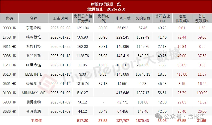 据LiveReport大数据统计,近10家上市的香港新股平均发行市值为517.30亿,最大市值为东鹏饮料,最小市值为BBSB INTL;平均发行PE为37.53倍,PE水平处于中高位;平均申购人数为137,707人,平均认购倍数为1879.43倍;平均基石占比为38.05%,基石平均比例略有回升;