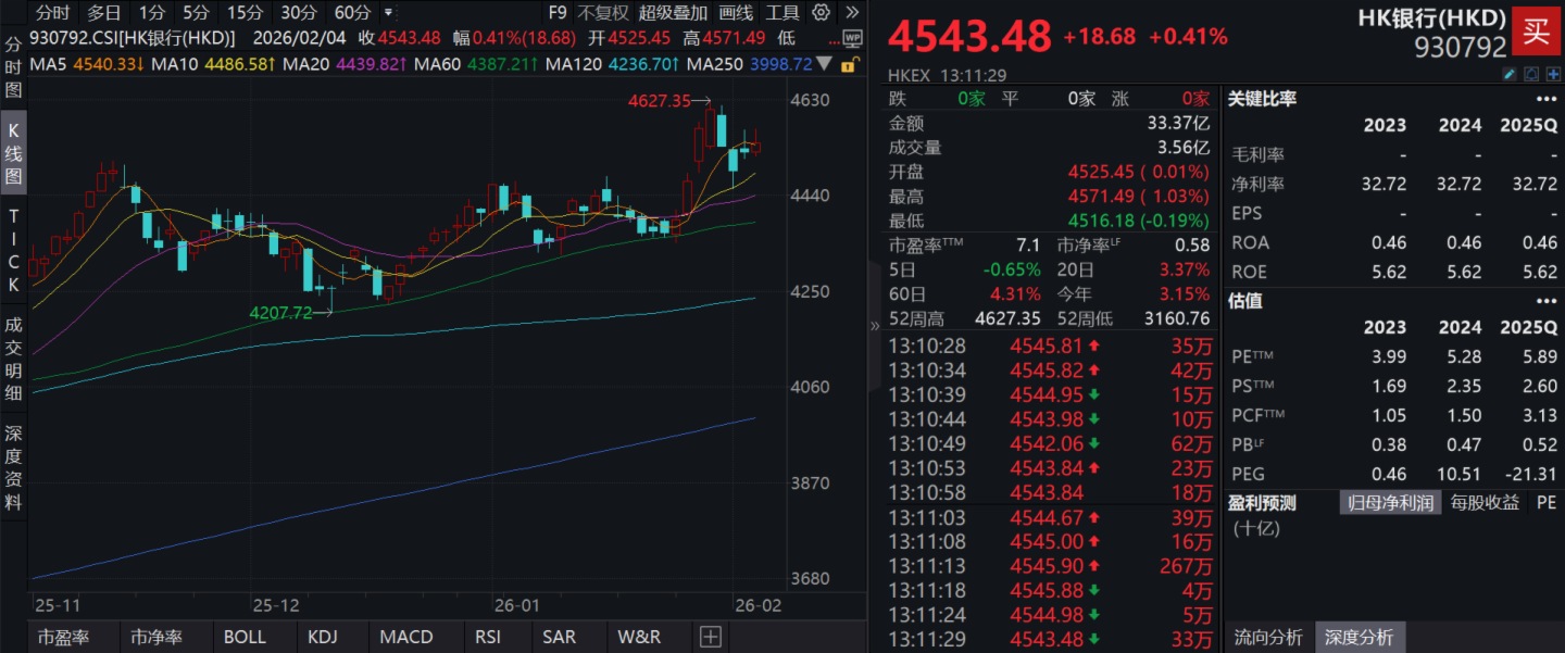 截至2026年2月4日 13:11,HK银行指数(930792)一度涨超1%,现涨0.41%,成分股青岛银行(03866)上涨5.50%,交通银行(03328)上涨2.40%,邮储银行(01658)上涨1.38%,中国银行(03988)上涨1.30%,重庆农村商业银行(03618)上涨1.22%。