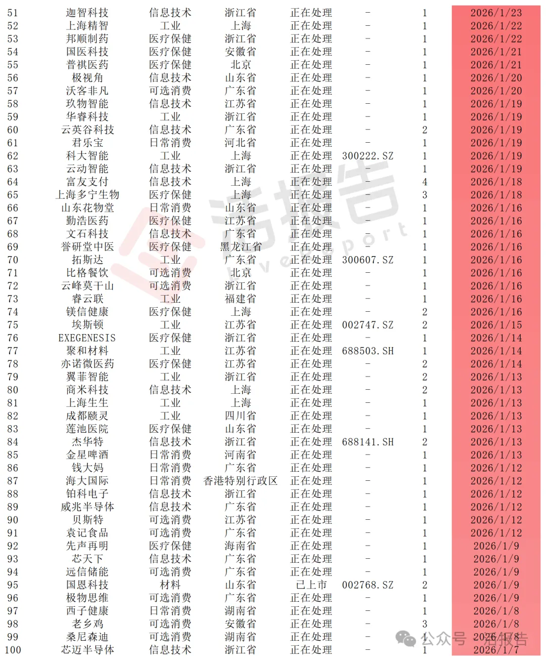 结合递表时间集中于2025年下半年和2026年1月的特征,并参考2025年信息技术与医疗保健行业通过备案的平均审批时长约250天的数据测算,若后续监管审核节奏总体保持稳定,预计很多公司有望在2026年中至2026年第三季度逐步上市。不过,实际上市进度仍受市场环境、监管审批效率及个别公司情况影响,可能存在一定波动。