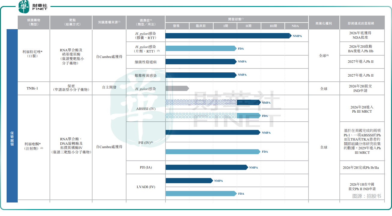 另一款核心产品利福喹酮(TNP-2092注射剂)则是一款三靶点治疗植入体相关细菌感染。截至今年1月24日,利福喹酮注射剂已获得国家药品监督管理局和FDA的新药临床试验(IND)许可,用于治疗人工关节感染(“PJI”)和急性细菌性皮肤和皮肤结构感染(“ABSSSI”)。