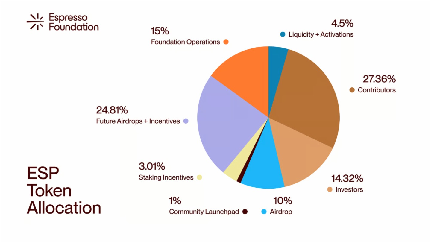ESP代币分配包括:贡献者(27.36%)、投资者(14.32%)、空投(10%)、社区启动板(1%)、质押激励(3.01%)、未来激励计划(24.81%)、基金会运营(15%)及流动性供应(4.5%)。空投部分将完全解锁,其他部分将根据不同的线性解锁计划分配。