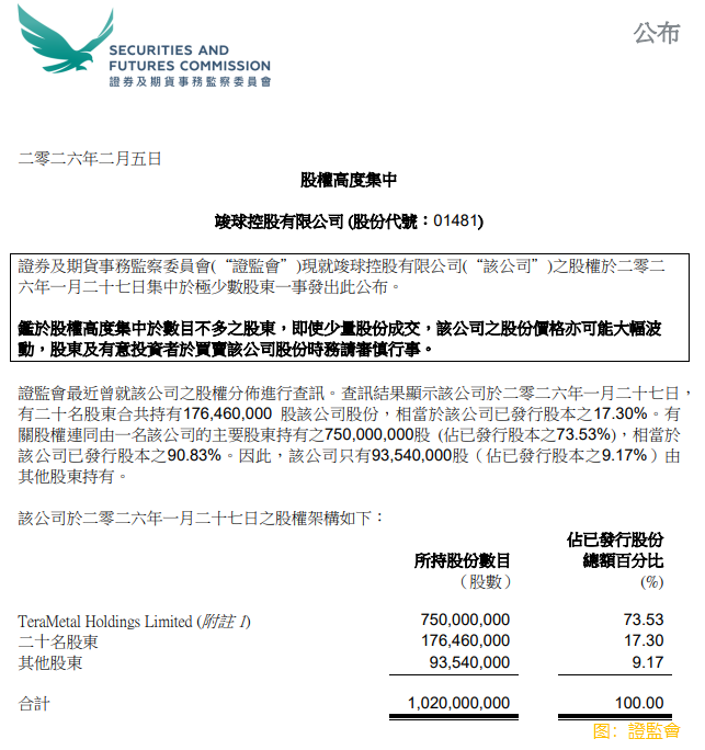 【财华社讯】2月5日,香港证监会最近曾就竣球控股有限公司(01481.HK)股权分布进行查讯。查讯结果显示该公司于2026年1月27日,有二十名股东合共持有约1.76亿股该公司股份,相当于该公司已发行股本17.3%。有关股权连同由一名该公司的主要股东持有7.5亿股(占已发行股本73.53%),相当于该公司已发行股本90.83%。因此,该公司只有9354万股(占已发行股本9.17%)由其他股东持有。