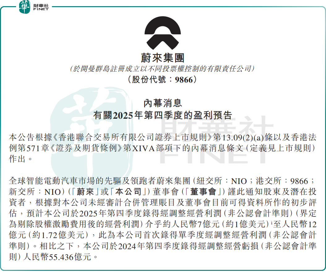 2月5日,蔚来发布2025年第四季度初步业绩预告,预计2025年第四季度录得经调整经营利润(非公认会计准则)介乎约7亿元至12亿元(单位人民币,下同)。这是蔚来首次实现单季度经调整经营盈利。2024年第四季度,蔚来录得经调整经营亏损(非公认会计准则)约55.44亿元。