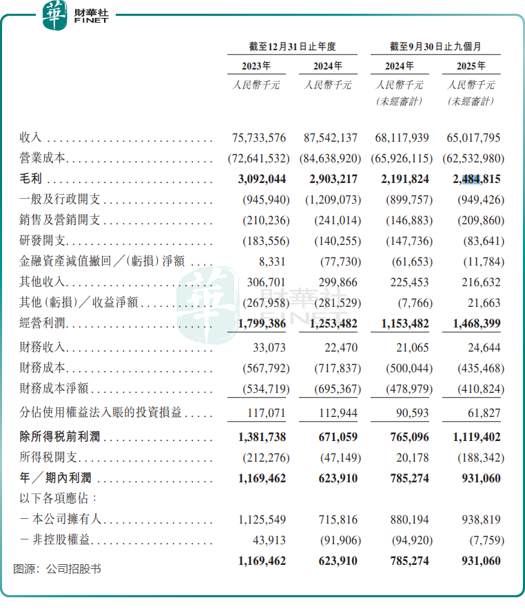 2025年前三季度,公司实现营业总收入650.18亿元(单位人民币,下同),同比下降4.55%,期内利润9.31亿元,同比增长18.56%。