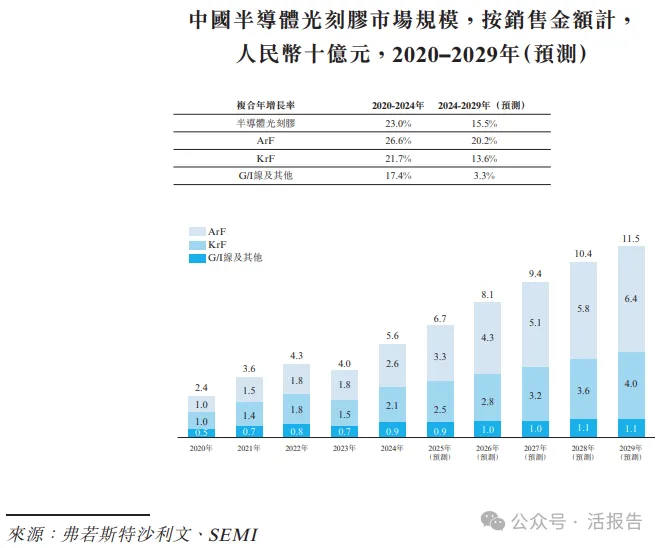 根据弗若斯特沙利文(Frost & Sullivan)的报告,中国半导体光刻胶市场的销售金额从2020年的人民币24亿元增长至2024年的人民币56亿元,复合年增长率为23.0%,预计2029年将达到人民币115亿元,期间复合年增长率为15.5%。