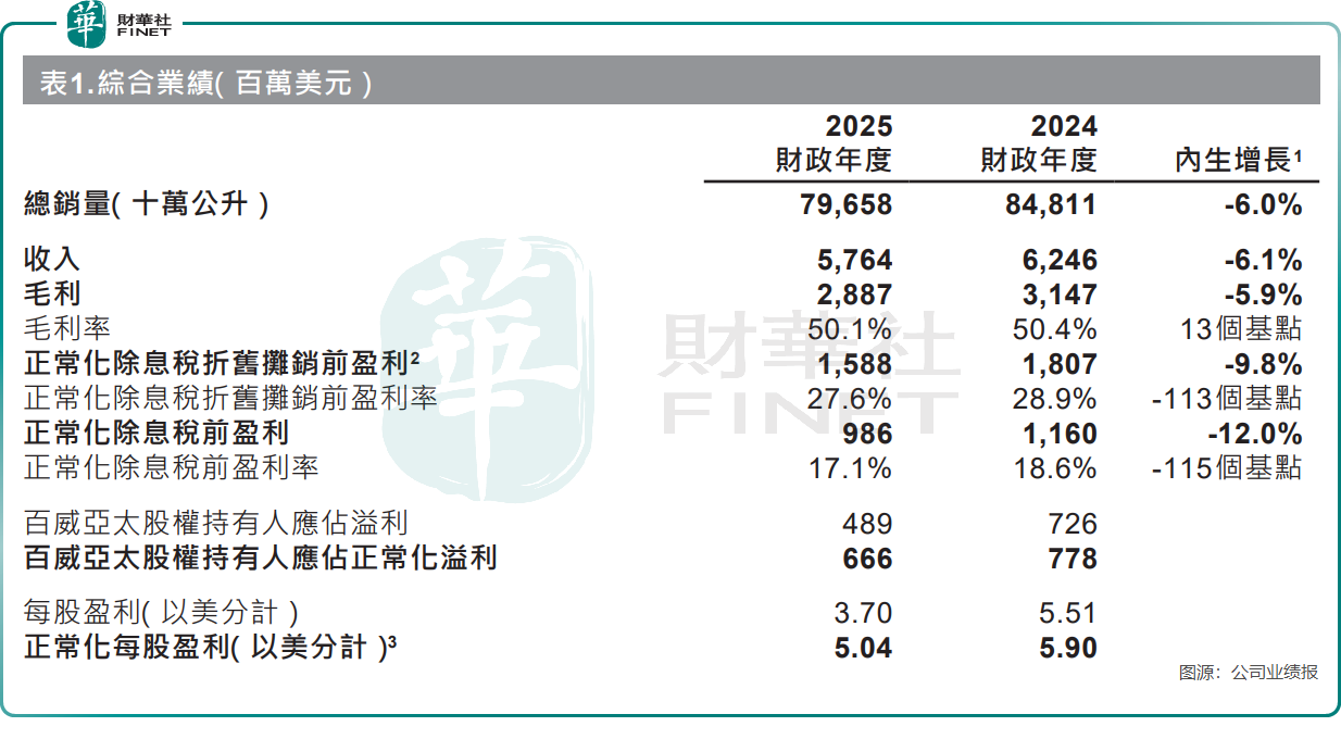2月12日,百威亚太(01876.HK)交出了2025年业绩答卷,这份成绩单用“全面下滑”形容毫不为过。公司全年销量同比减少6.0%至79,658十万公升,收入57.64亿美元同比下滑6.1%,股权持有人应占溢利4.89亿美元更是大幅缩水32.6%。
