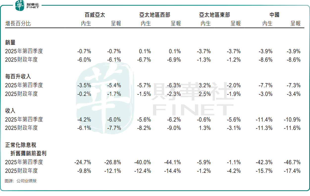 公司首席执行官程衍俊在业绩公告中坦言,“2025年,我们在中国的业绩未尽潜能”。全年数据显示,中国市场销量同比减少8.6%,收入下滑11.3%,每百升收入下降3.0%,均超过整体降幅,三大核心指标全面承压。