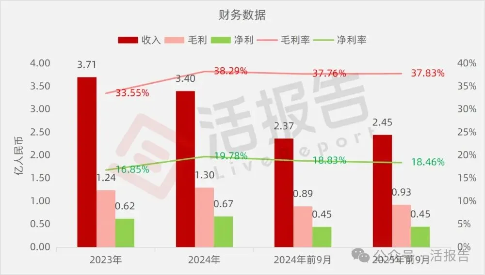 收入分别约为人民币3.71亿、3.40亿、2.37亿、2.45亿,2025年前9月同比+3.51%;