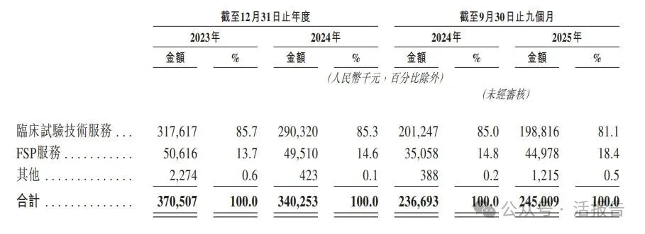 于往绩记录期间,临床试验技术服务贡献公司大部分的收入。公司主要透过以下各项经营业务:(i)临床试验技术服务;(ii)FSP服务;及(iii)其他,主要包括试验参与者招募及单独的中心管理服务。