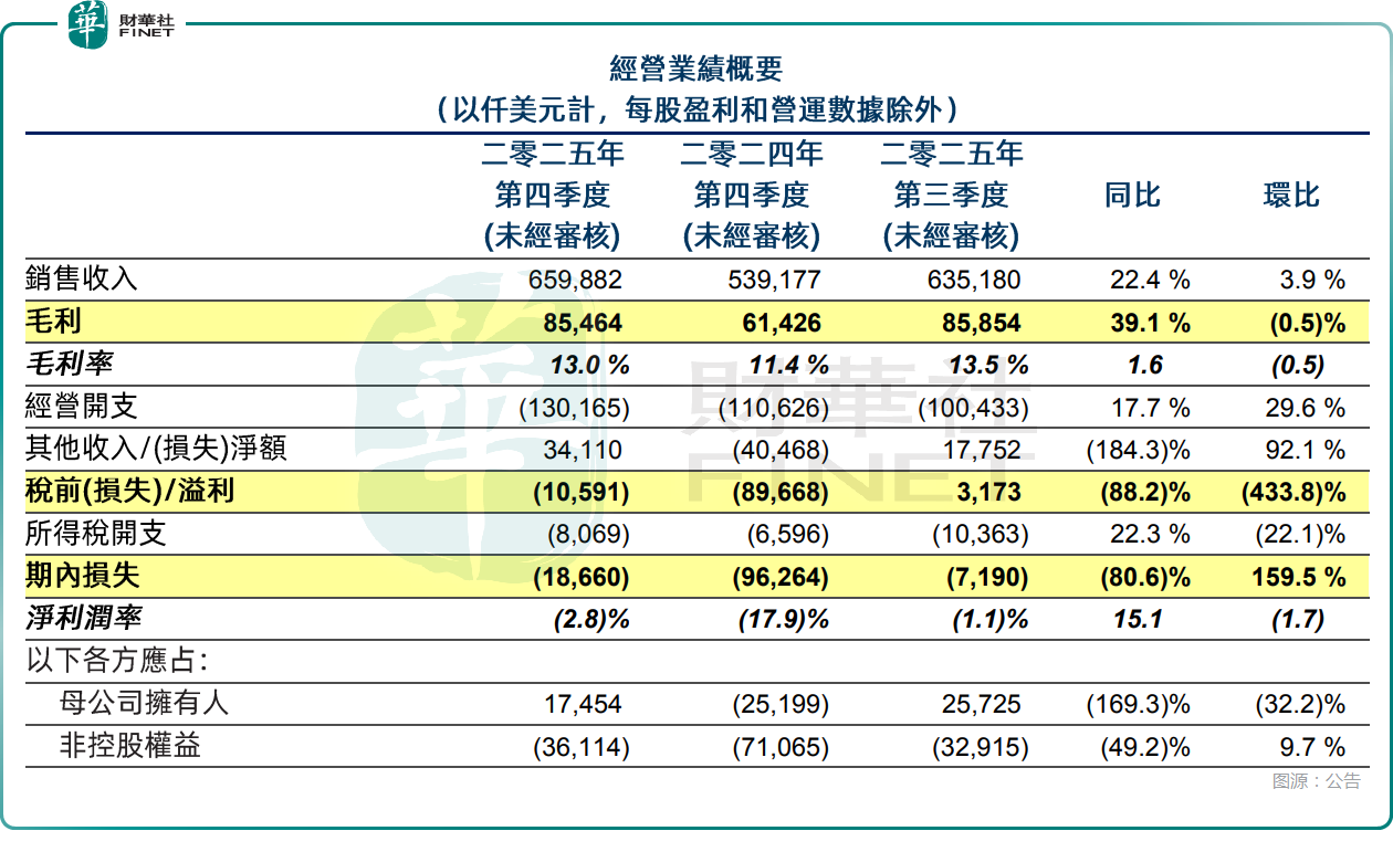 其中,单季度来看,第四季度销售收入为6.60亿美元,不仅环比增长3.9%,同比增幅更是达到22.4%,销售收入再创历史新高,主要得益于付运晶圆数量上升及平均销售价格上涨;当季毛利率升至13.0%,环比下降0.5个百分点,同比上升1.6个百分点。期内母公司拥有人应占利润为1745.4万美元,上年同期为亏损2519.9万美元,上季度为利润2572.5万美元。