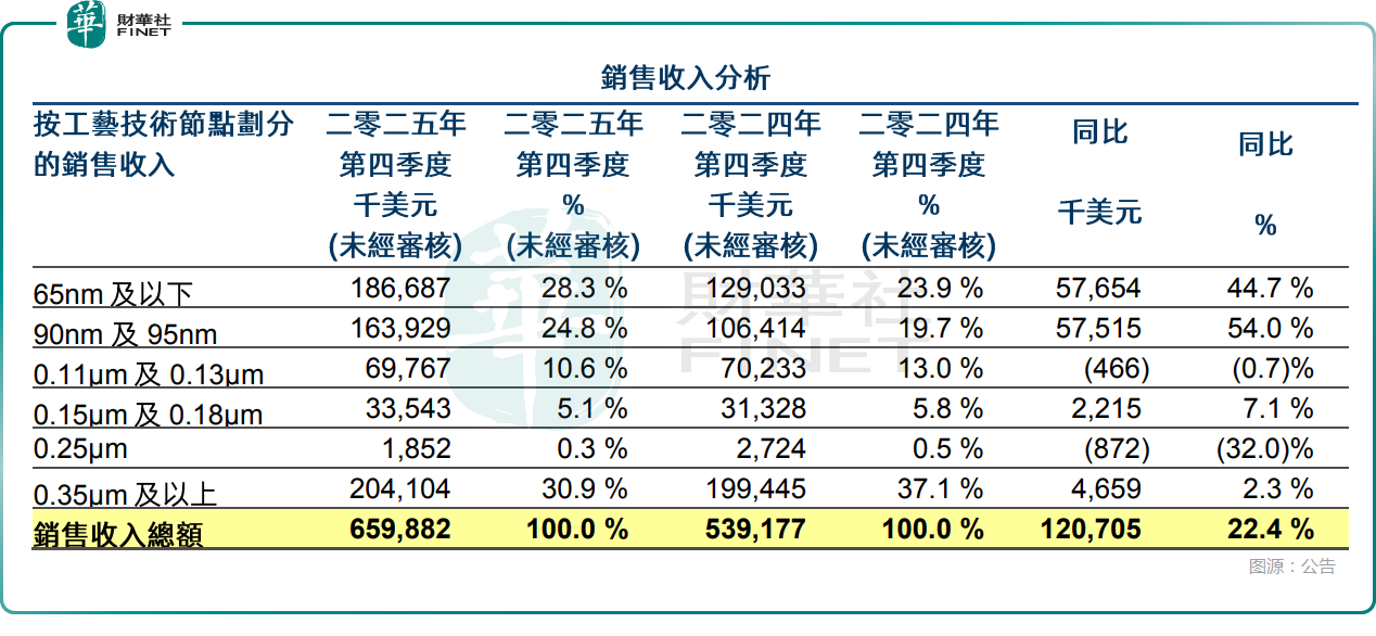 产品结构的持续升级,是华虹半导体业绩增长的核心驱动力。其中,2025年第四季度,65纳米及以下工艺收入同比大增44.7%,该工艺主要应用于闪存、MCU、CIS及RF等产品的需求增加;90/95纳米工艺收入同比增长54.0%,来源于MCU、智能卡芯片等产品的需求增加,两大核心工艺的快速增长,推动公司产品结构持续升级。