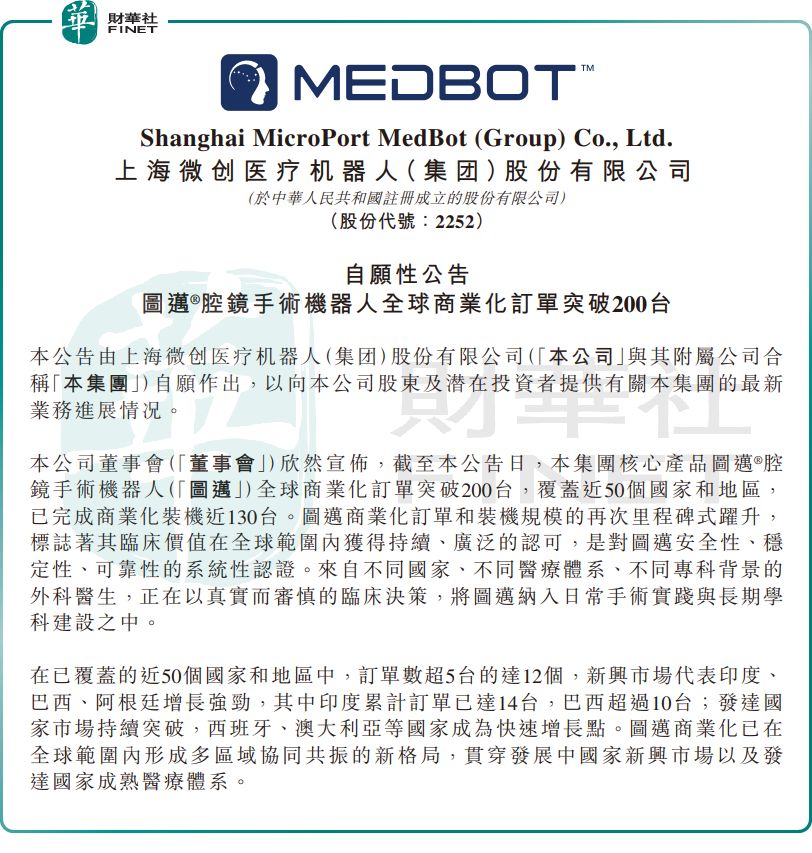 2月12日,微创医疗机器人发布公告宣布,其核心产品图迈腔镜手术机器人全球商业化订单突破200台,覆盖近50个国家和地区,已完成商业化装机近130台。