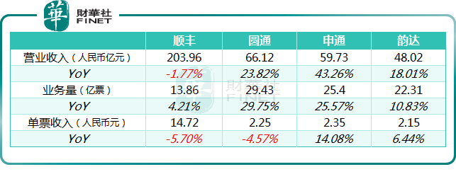 业务量方面,四家企业均实现同比增长,圆通与申通增速均超20%,韵达亦超10%。