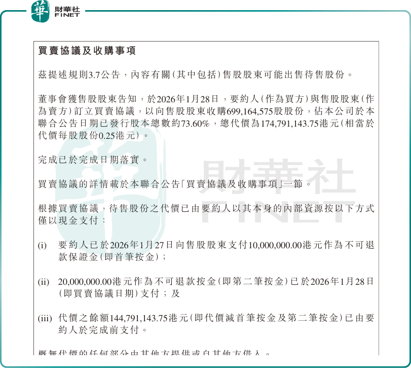 消息面上,2月11日,GUANZE MEDICAL宣布,要约人富德(香港)投资向控股股东收购约6.99亿股股份,占该公司已发行股本总数约73.6%,总代价约1.75亿港元。紧接完成后,要约人及一致行动人士须按例提出无条件现金要约,以收购该公司全部已发行股本。现金要约价每股0.25港元,较停牌前收市价1.56港元,折让约84%。