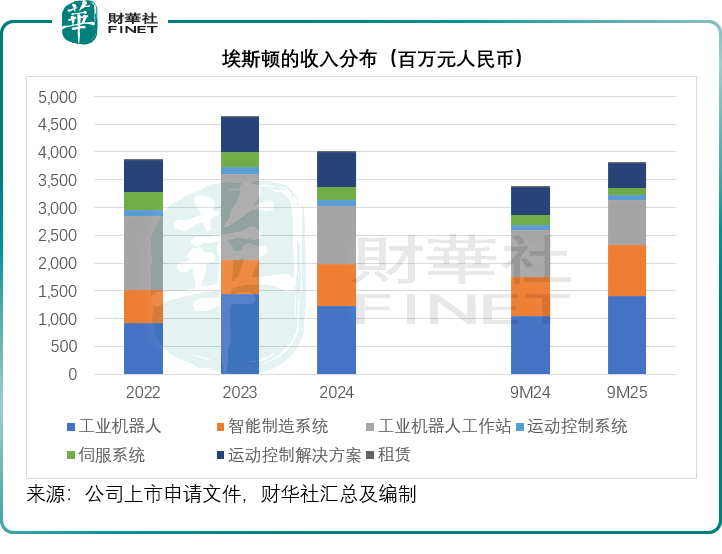 埃斯顿的业务涵盖了自动化核心部件、运动控制系统、机器人本体及完整解决方案。这种“核心部件+本体+集成”的全产业链模式,使其在国内供应商中拥有最大的收入规模。2025年前三季度,该公司总收入达38.04亿元(单位人民币,下同),其中工业机器人及智能制造系统贡献了31.38亿元,占比达82.51%,见下图。