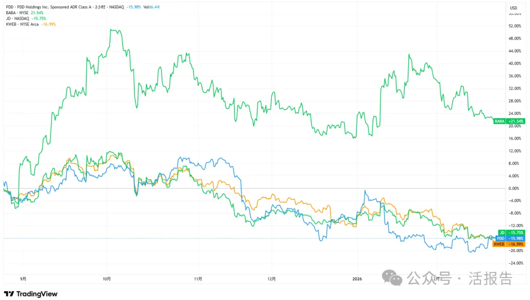 其中,电商三巨头之一的拼多多股价较去年11月份高点已累计下跌超过两成,表现逊于阿里巴巴、京东等竞争对手,也未跑赢整体中概互联网指数ETF(KWEB.US)。