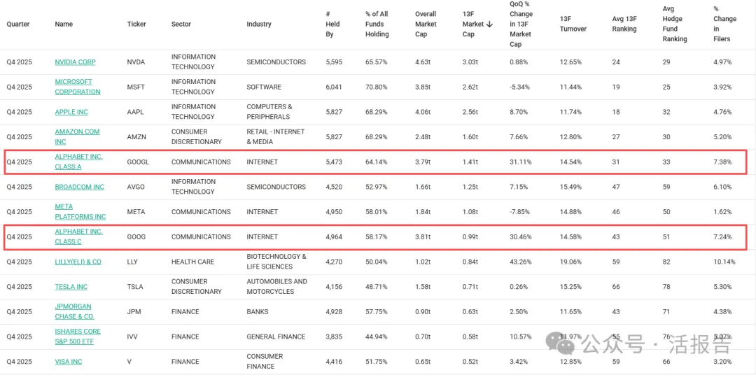 从截至2025年底的13F机构持仓数据中可以看到,市场对谷歌的看好力度在第四季度显著加强:截至2025年底,超过5000家机构持有谷歌-A/C股票,2025年Q4持仓增幅超30%,是科技巨头中被增仓最明显的公司。