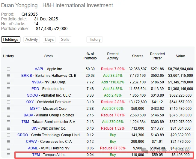 值得注意的是,段永平在2025Q4也建仓了Tempus AI。尽管其在同期还建仓了Credo Technology、Coreweave等AI基础设施股,但Tempus AI作为其在AI垂直应用层的首次投资,试水意图明显。