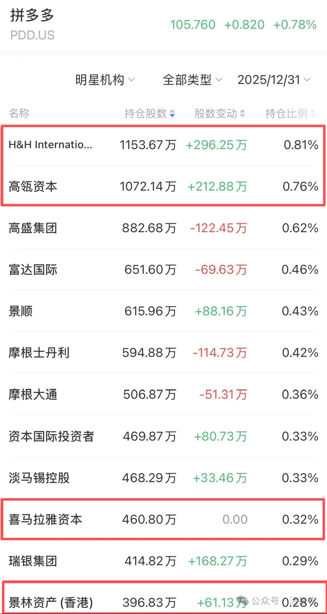 从13F机构持仓数据中可以看到,拼多多在2025年第四季度获高瓴、景林、高毅等头部中资机构以及段永平的集体加仓,成为看多共识最强的中概股之一。