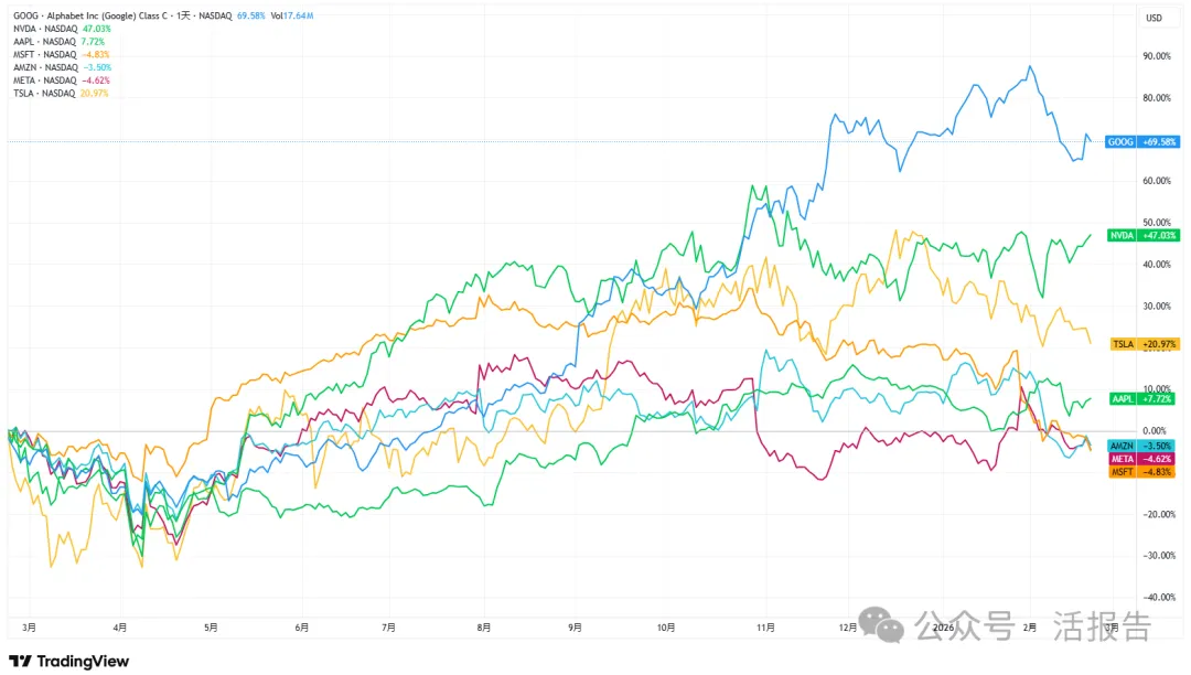 过去一年里,美股科技七巨头中,谷歌以70%的涨幅一马当先,正是其AI实力获得市场广泛认可的体现。相比之下,英伟达累涨约47%,已落后于谷歌;微软、亚马逊、META则略有下跌,反倒成为七巨头分化表现中的失败者。