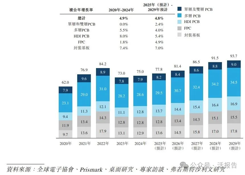 根据弗若斯特沙利文(Frost & Sullivan)的报告,全球PCB市场规模从2020年的620亿美元增长至2024年的750亿美元,2020年至2024年期间的复合年增长率为4.9%。预计到2029年PCB市场全球销售收入将达到937亿美元,2025年至2029年期间的复合年增长率为4.8%。
