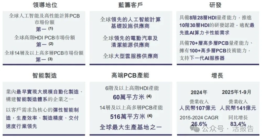 公司是全球领先的人工智能及高性能计算PCB供应商,专注于高阶HDI、高多层PCB的研发、生产和销售。根据弗若斯特沙利文的资料,以2025年第一季度人工智能及高性能算力PCB收入规模计,公司的市场份额位居全球第一,核心应用涵盖AI算力卡、服务器、AI服务器、数据中心交换机、通用基板等关键设备。