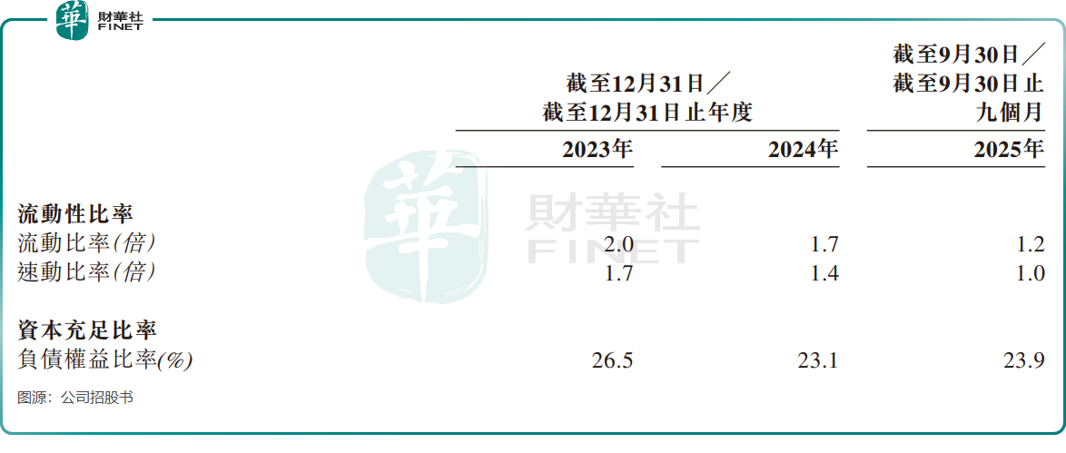 财务数据显示,公司流动性已亮起“黄灯”。截至2025年9月30日,公司流动比率仅为1.2倍,速动比率1.0倍,均处于偏低水平,显示短期偿债能力承压;同期现金及现金等价物仅为5742.3万元,而经营活动所得现金流量净额为1.65亿元,较上年同期持续下滑。