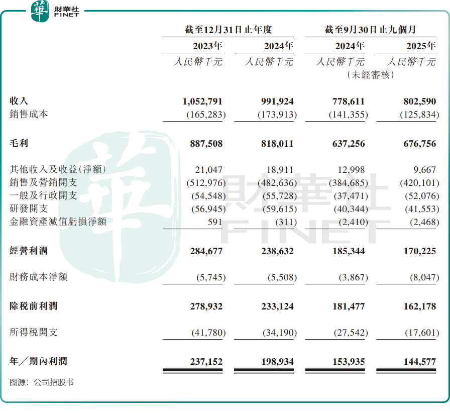 但过度依赖单一产品的风险也不容忽视。随着复方黄柏液涂剂对医院的最高售价下降,公司整体收入从2023年的10.53亿元(单位人民币,下同)减少至2024年的9.92亿元,降幅5.8%;期内利润从2.37亿元降至1.99亿元,降幅16.1%;2025年前三季,期内利润进一步同比减少6%至1.45亿元,业绩持续滑坡趋势明显。