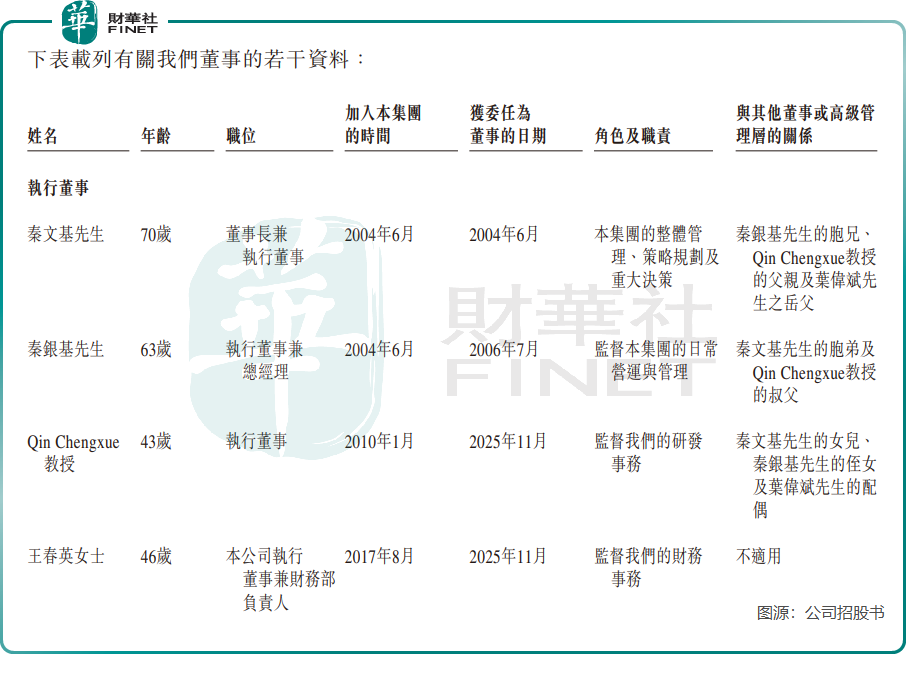 根据招股书,秦文基担任公司董事长及执行董事,负责整体管理、策略规划及重大决策;秦银基任执行董事兼总经理,监督日常营运;秦文基之女Qin Chengxue担任执行董事,负责研发事务;公司秘书叶伟斌则是Qin Chengxue的丈夫,形成了紧密的家族治理格局。这种高度集中的家族式管理,在企业发展初期可能有助于决策高效执行,但长期来看,可能面临治理结构单一、决策缺乏制衡、职业经理人发展空间受限等潜在问题,尤其在企业迈向资本市场后,如何平衡家族利益与公众股东权益,将成为重要考验。